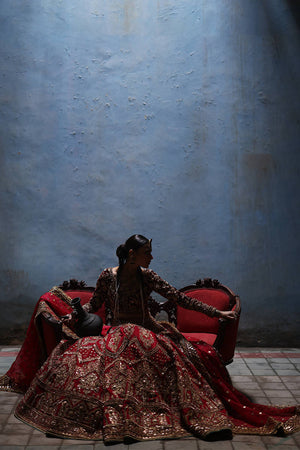 Make a bold statement with "Waheeda" in sindoor red from the Gold Series Hussan Ara Mansion Collection by Mohsin Naveed Ranjha. The choli, adorned with opulent multihead embroidery of floral vines on velvet fabric and heavily accented with gold embellishments, sequins, and beads, exudes regal allure. Paired with a Lehenga featuring intricate multihead embroidery depicting mughal architecture motifs on Italian silk fabric and accented with heavy adda work, it's a masterpiece of opulence. Complete your ensemble with two divine dupattas: the main dupatta boasts multi-head embroidery on organza fabric with heavy embellishments in gold, sequins, and threadwork, attached with four-sided heavily embellished velvet borders, while the second dupatta features multi-head embroidery coupled with a spray of sequins and block printed motifs on organza fabric, along with velvet embroidered borders on all four sides. The accompanying pouch, adorned with luxurious embroidery on velvet fabric and matching adda work, adds the final touch of elegance