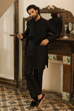 A short self-cotton kurta and trousers in Midnight Black with tonal black anchor and Resham embroidery across the chest. The loop-button band collar neckline and embroidered sleeve borders offer a structured, modern finish. An ideal pick for Eid evenings—whether stepping out for a festive dinner or enjoying the night breeze on a rooftop gathering.
