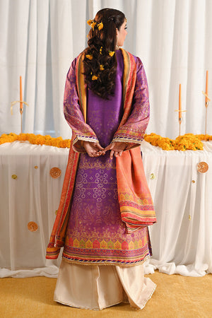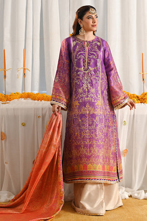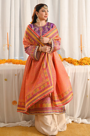 This exquisite ensemble is a masterpiece of intricate detailing. The deep purple hue, accented by shimmering gold, exudes a regal elegance. The chatta patta border adds a touch of traditional charm, while the multi-layered elements create a visually striking effect. The ombre chunri dupatta, transitioning from nudes to mustard, offers a subtle yet sophisticated contrast.