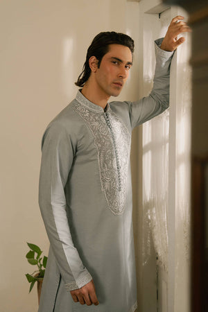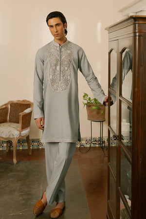 A sky mist hued short cotton kurta with loose trousers, featuring white anchor and Resham embroidery of floral vines. The embroidery is encased in a circular frame around the button placket, with borders along the neckline, sleeves, and hem. A graceful ensemble for Eid mornings, blending softness and structure for a look that feels as fresh as the celebrations ahead.