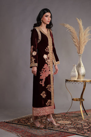 The outfit is a luxurious deep maroon velvet jacket with intricate embroidery and embellishments, perfect for formal or festive occasions. The front-open style features a heavily adorned front with golden embroidery, sequins, and extending from the neckline to the hem. The neckline and sleeve cuffs are bordered with ornate golden detailing, adding a regal touch. The jacket is further decorated with floral and paisley-inspired motifs, symmetrically placed to enhance the richness of the design. A broad golden hemline complements the overall grandeur, while the plush velvet fabric adds depth and elegance. Paired with metallic heels, the outfit exudes sophistication and opulence.