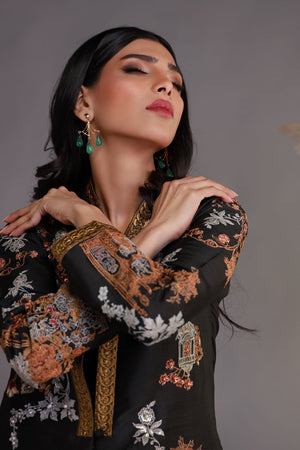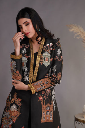 This outfit is a sophisticated black ensemble featuring vibrant multi-colored embroidery inspired by architectural and floral motifs. The kurta is adorned with intricate detailing on the front, sleeves, and hemline, highlighted by accents of gold, red, and green. The neckline is elegantly finished with a gold embellishment, adding a touch of luxury. The design transitions into an ornate border at the hem, creating a striking visual contrast. Paired with solid black straight trousers, this ensemble is a perfect blend of tradition and modern elegance, making it suitable for festive or formal events.