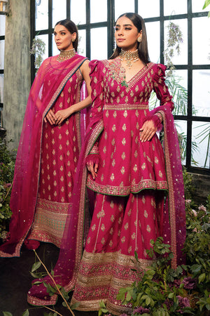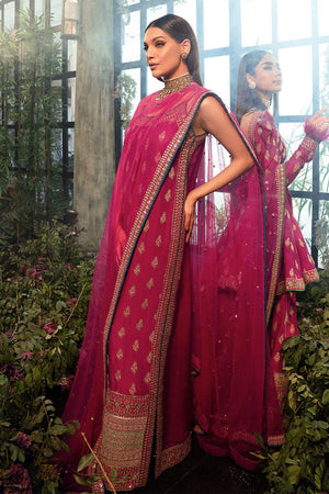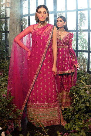 A stunning sleeveless hot pink long shirt with heavy embroidered borders. Paired with an eye catching hot pick sequenced dupatta.shirt length: 58