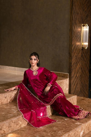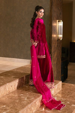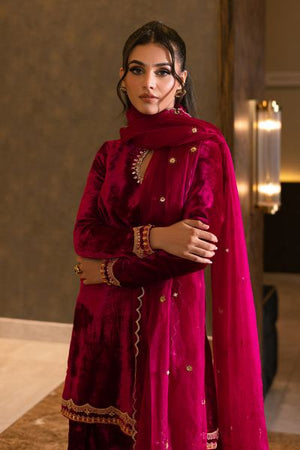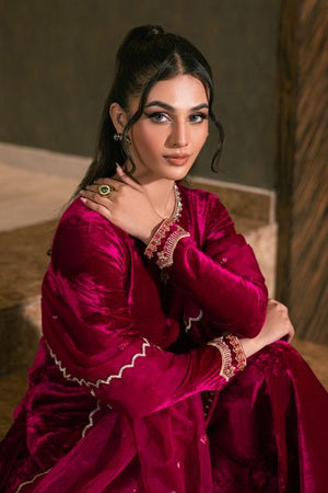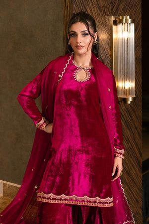 This enchanting outfit features a baggy shalwar and kameez crafted from soft velvet in a rich dark pink hue, offering a perfect blend of comfort and style. The kameez showcases an exquisite neckline, beautifully designed to enhance the overall elegance of the ensemble. The flowing silhouette of the shalwar adds a relaxed yet chic touch, allowing for effortless movement. Complementing the look is a stunning dupatta, intricately embellished to elevate the outfit further making a bold statement while ensuring you feel both glamorous and comfortable.
