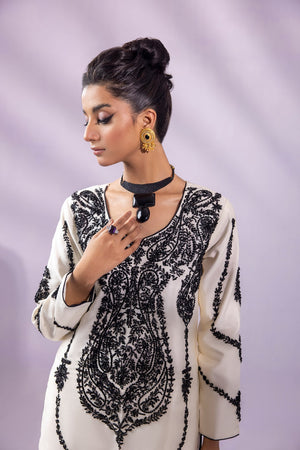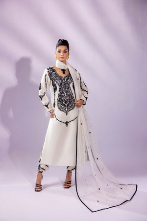 An endearing long tissue organza ivory shirt with neckline heavily embellished with black sequins, cut dana, pipes and Swarovski crystal work . Its 3 yards long organza dupatta has an intricately embellished boarder on all four sides. Outfit also contains classic embellished pants.