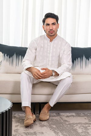 Presenting a luxurious ensemble featuring an embroidered raw silk kurta, paired with matching raw silk pants. This outfit highlights sophistication and artistry, making it an excellent choice for special occasions. The detailed embroidery on the kurta enhances its charm, while the soft raw silk fabric ensures comfort and elegance.