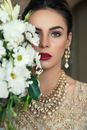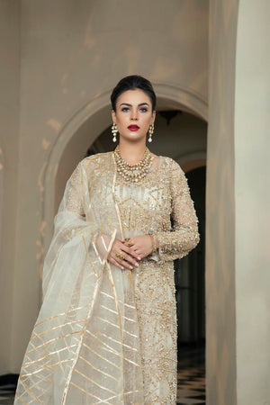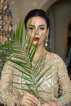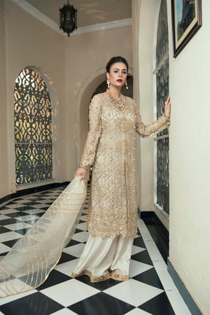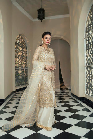 This gold white dress is a meticulous composition of kathan organza shirt and dupatta with tilla work and hand embellishments with sequins. The sheer look is finished off with embroidered palazzo trousers.its a four piece stitched outfit including shirt, slip, trousers and dupatta.Fabric: Organza