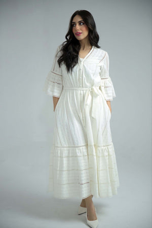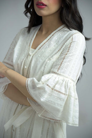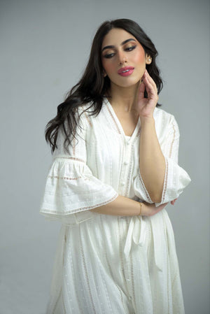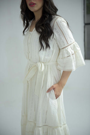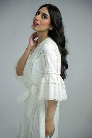 Effortlessly stylish and comfortable, our white Chikankari summer dress is the perfect addition to your wardrobe. Featuring a chic belt, playful balloon sleeves, and convenient pockets, it's the ultimate combination of fashion and function. Note: In case of confusion over it being see through- a normal camisole or tank top with white tights or pants make the dress almost non see-through! So don't worry!