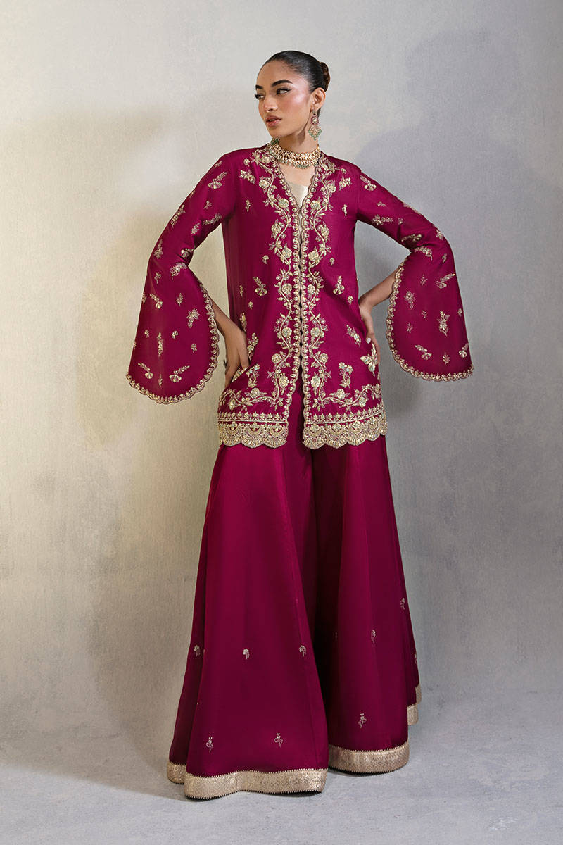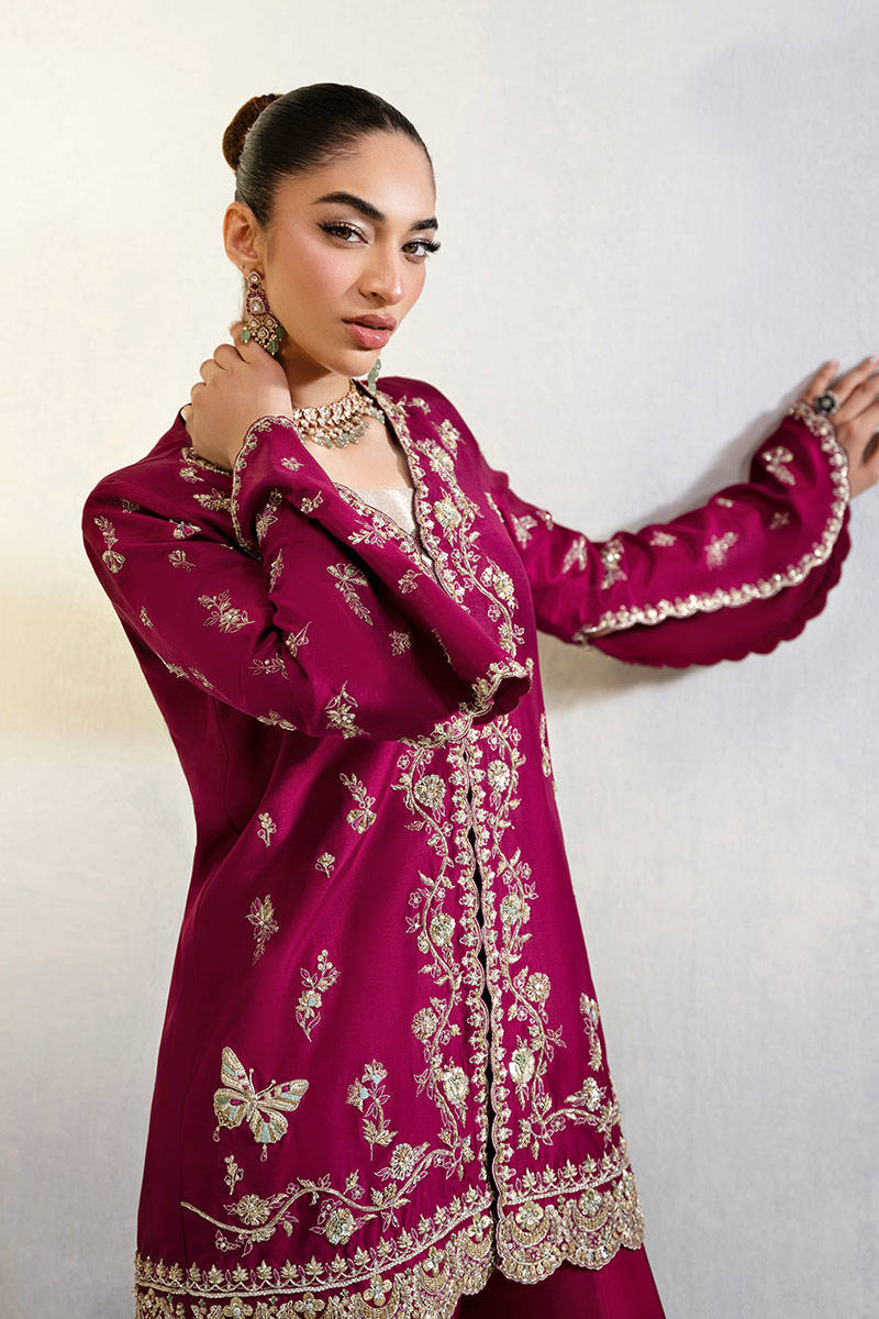 Wine Affair is a versatile short jacket crafted in pure raw silk, richly adorned with intricate resham embroidery and exquisite hand embellishments using gold kora, dabka, and delicate naqshi work that exude regal charm. The modern slit sleeves introduce a fusion twist, making this piece effortlessly suitable for both traditional celebrations and contemporary festivities. Paired with a gold blouse and a pure tissue lehenga, adding depth and a refined elegance—perfect for the modern-day bride seeking timeless glamour with a contemporary edge. The look is completed with a sheer, pure tissue dupatta, delicately finished with sitara chann and hand-embellished borders, adding a final layer of ethereal grace.