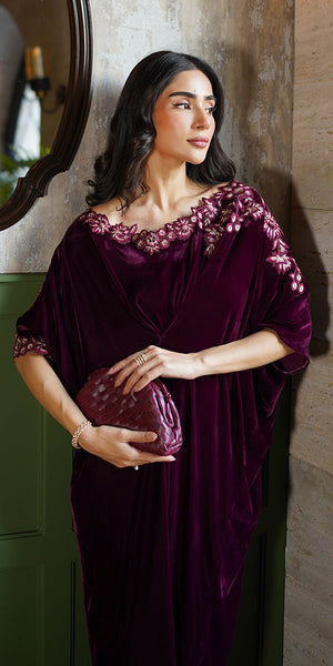 Elevate your winter wardrobe with this deep wine kaftan, a true embodiment of luxury. Featuring a chic off-shoulder neckline, adorned with exquisite cutwork embroidery in gleaming gold metallic thread and resham, it’s a flawless fusion of opulence and artistry—designed to make you a style icon.