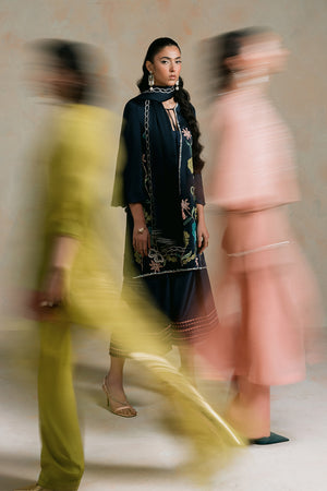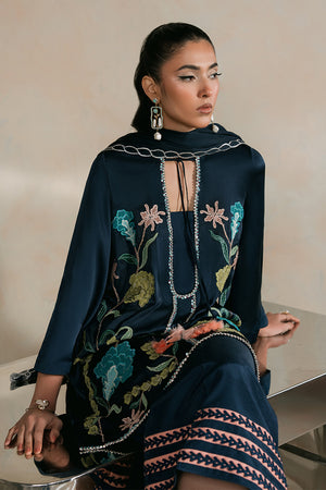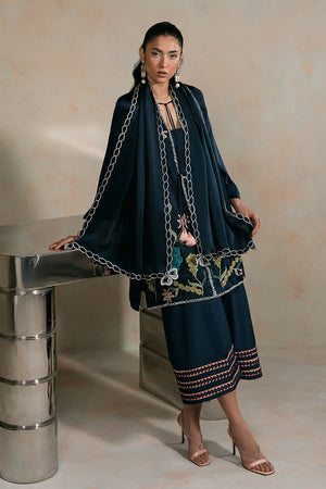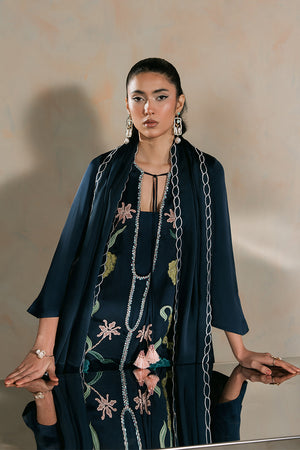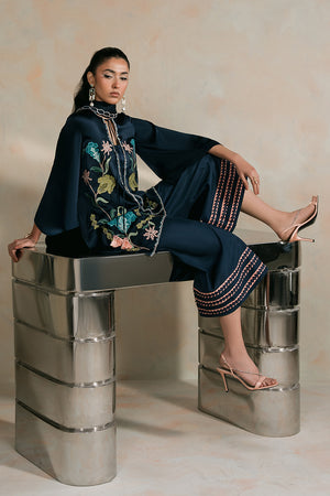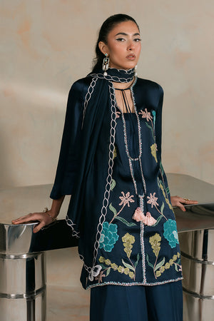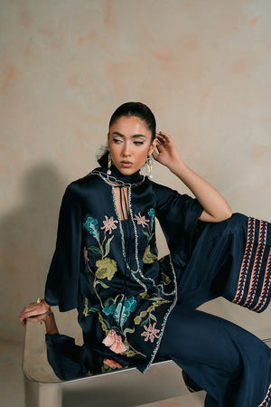 Winner—a refined navy-hued ensemble that exudes effortless sophistication. Crafted from luxurious Chimose silk, the mid-thigh relaxed fit shirt features short side slits, adorned with patched florals and intricate embroidery, further elevated with an embellished border for a striking finish. A contrast tassel detail adds a playful yet elegant touch, while the Thai silk culottes are designed with a contrast band and delicate lace detailing for a polished look. The ensemble is completed with a Chimose silk scarf, finished with a beautifully embroidered scalloped border, adding an air of timeless charm.