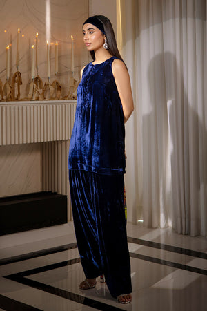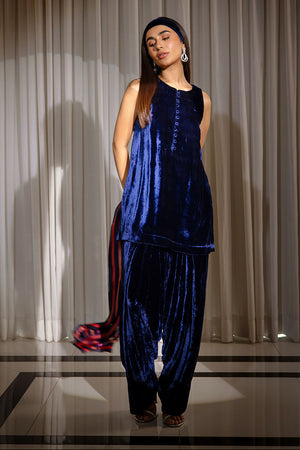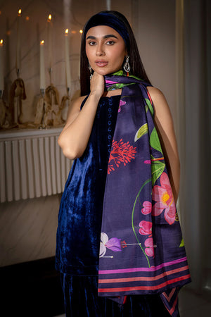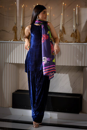 This exquisite sleeveless halter neck short shirt in a vibrant blue fabric exudes a touch of modern elegance. The khuli shalwar with front buttons adds a playful yet sophisticated element to the ensemble. The digital printed stole, featuring intricate patterns, complements the shirt beautifully, creating a harmonious and visually striking look.