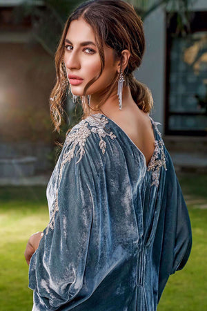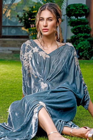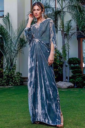 An ultra-modern pure velvet grey color kaftan with contemporary V-neckline crafted with 3D jeweled flowers, resham, stones, zari and pearls. Pleats on the waist gives the body a perfect hour glass shape.Color: Grey