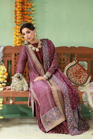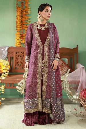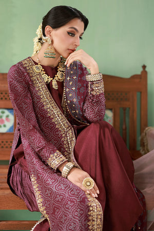 Front-open raw silk jacket in deep purple with screen print detailing, adorned with gold kaam, sequins, gota, moti, and cut dana. Paired with crushed dhaka pants for added texture and volume.
