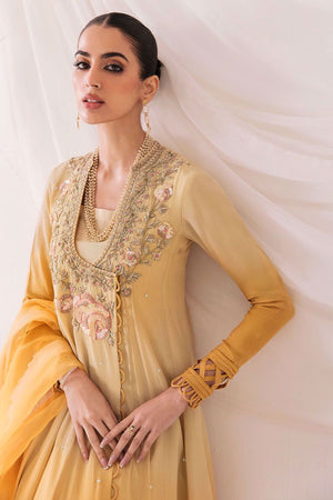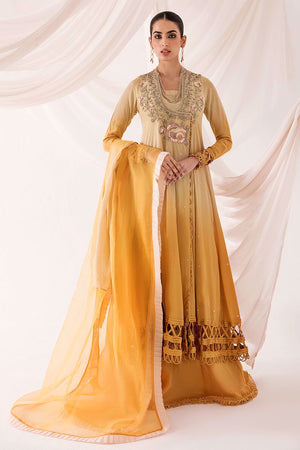 Adorned with delicate hand-embroidered zari sequins and pearl work on neckline. This mustard ombre style classy silhouette of grip angrakha with all-over sequin spray and heavy fabric manipulation on the hemline paired with raw silk sharara and a combination of grip and organza dupatta to complete the look.