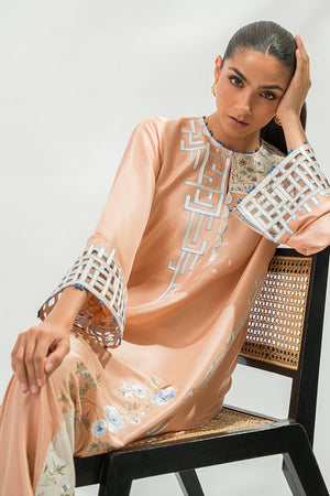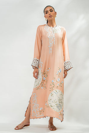 'A salmon pink kaftan is adorned with delicate floral embroidery and appliqued accents. Cutwork and fabric manipulated details complement the look.