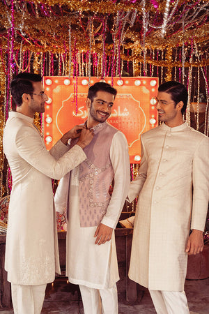 "Yousaf" our signatur MNR ensemble is a harmonious blend of youthful charm and refinement. The lilac-hued karandi waistcoat, embellished with exquisite Mughal paisley boteh and delicate borders of floral vines, exudes a princely aura. Paired effortlessly with a karandi kurta featuring intricate embroidery on the sleeves and plain pajama, this ensemble embodies the essence of festive celebrations. The waistcoat draped over the kurta and pajama creates the perfect fusion of grace and style, an ideal choice for those special occasions where elegance takes center stage.