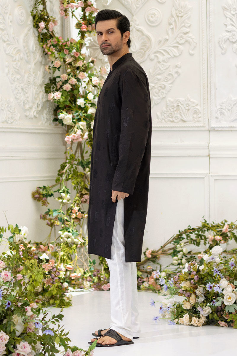 A simple black kurta with a V-neck and long, fitted sleeves. It is complemented with white straight pants, giving a clean, modern feel.