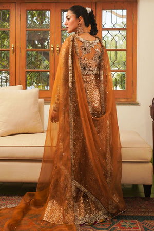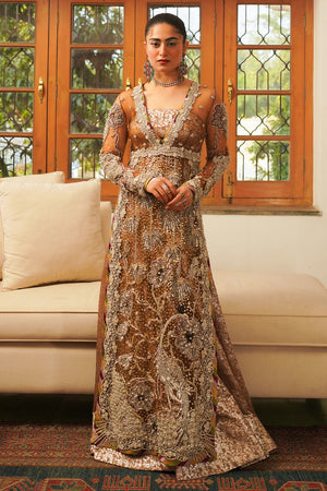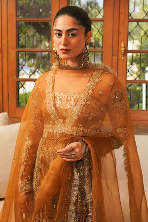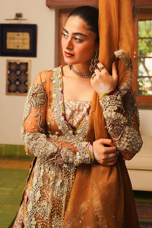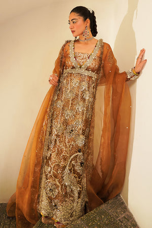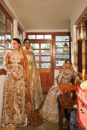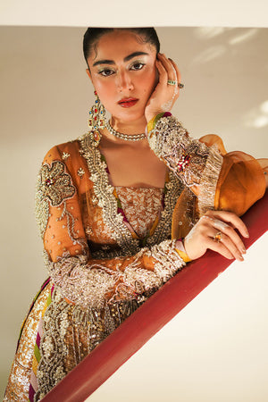 Embrace the regal splendour with 'Sarkaar' in enchanting jade green. It features a fully hand-embellished net shirt, boasting intricate nakshi dabka and gota work, and a V-neckline that exudes timeless sophistication. The fitted embellished sleeves add a touch of grace. Paired with a bootcut trouser featuring banarsi and rawsilk fabric stripes and a net dupatta with a delicate kiran lace border. Make this a perfect choice for the big day.