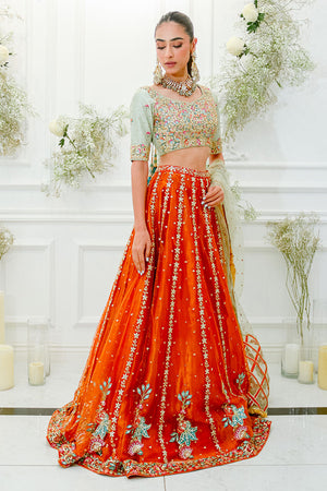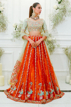 Step into the realm of mesmerizing contrasts with this rust and mint lehenga choli. The mint raw silk choli, adorned with intricate embroidery and handwork, radiates a serene elegance. Paired with it, the net lehenga, a masterpiece in itself, showcases elaborate embroidery and handwork, intricately woven with gota, dabka, and sparkling stones. This ensemble is beautifully balanced with a delicate net dupatta, enhanced with gota detailing, creating a harmonious blend of traditional craftsmanship and contemporary allure.