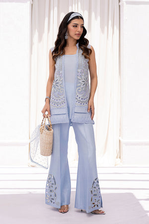 Sleeveless open-front jacket made in baby blue organza, layered over a plain crepe slip. The jacket features oversized khaddi silk appliqués in sage and purple, placed across the front and back. Cutwork detailing is incorporated throughout the appliqué, adding dimension without extra surface embellishment. The pants are bootcut, tailored with matching cutwork at the hem and a clean side slit on each leg for ease of movement.