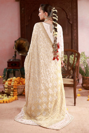 Crafted in white raw silk, this kalidaar kurta features chaak and fitted sleeves with paisley motifs embroidered in moti, nakshi, sequins, and tiki stones. Paired with wide-leg pants detailed with dhanak on the hem. The look is completed with a white and gold Banarasi dupatta, with touches of the same fabric applied on the shirt.