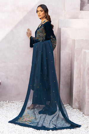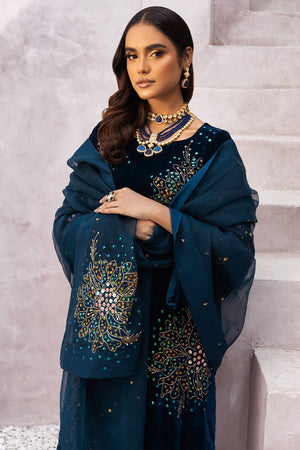 In a striking teal blue hue, this long silhouette is undeniably a head-turner. The modern handwork of cut dana, sequins, and pearls, particularly in the form of floral motifs on the overall shirt and sleeves, adds a contemporary and eye-catching allure.Complementing the ensemble is a beautiful floral hand-embellished dopatta that adds an extra layer of elegance and flair. Paired with wide-leg shesha silk pants, this outfit becomes a must-have statement piece in your wardrobe.