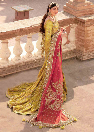 Description: A beautiful lime green bridal comprising of a raw silk shirt extensively hand rendered in dabka, sheeshagari, Swarovski, sitara and gotta, paired with an organza farshi gharara embroidered with resham and tilla and embellished using gotta, dabka, sitari and sheeshagari. It comes with two organza dupattas to complete the look. The heavy dupatta is framed with a beautifully hand embellished border and circular motifs all over hand crafted with love and finished with our signature tamba kiran. The light kacha tilla dupatta is embroidered in aari and has accents of chatta patti and gotta. It comes with a matching pouch.This is a 4 Piece Stitched Bridal Outfit