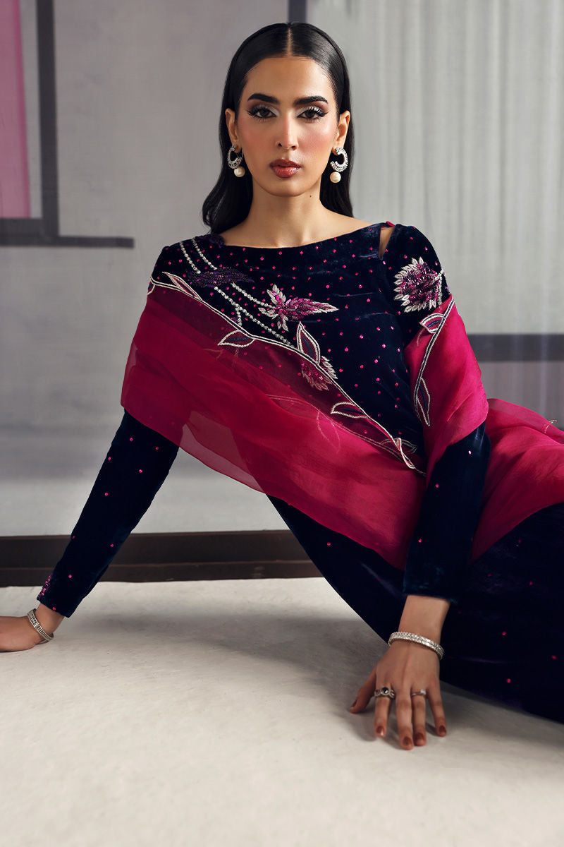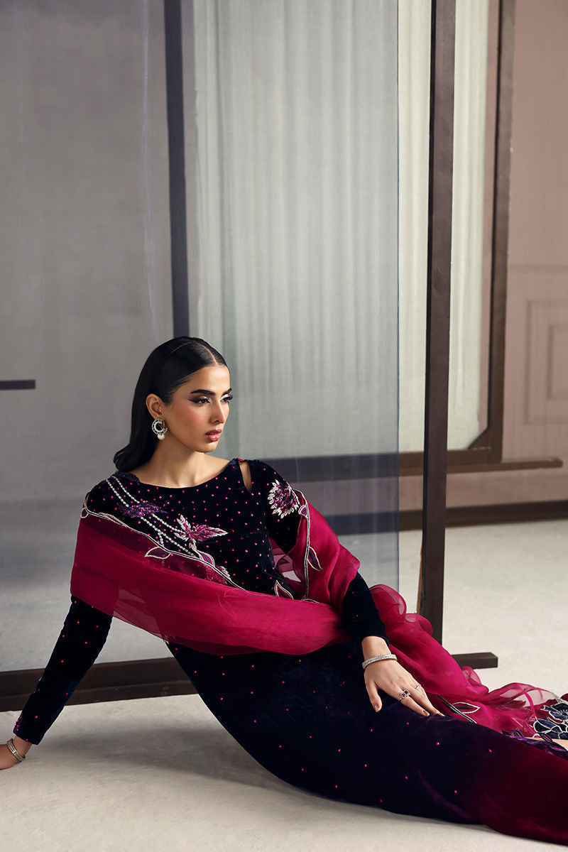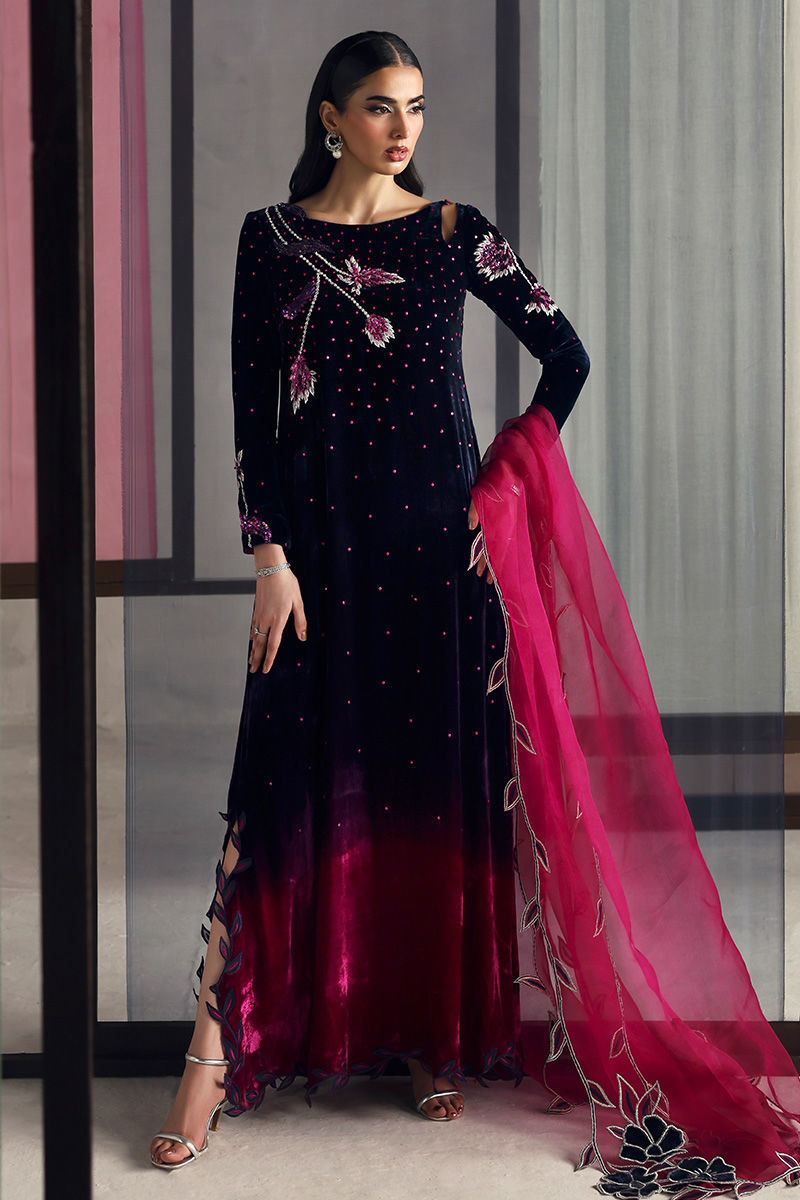 A striking blue and shocking pink kaftan crafted from pure velvet, radiating bold elegance. Paired with a pure medium organza dupatta, it beautifully balances luxury with a touch of vibrant sophistication.