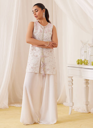 Steal the moment this season and every season that follows with the absolutely stunning Zana Pearl ensemble. Cut from intricately embroidered raw silk in a crisp time ivory, it is immaculately tailored to create a contemporary, universally flattering silhouette. The round neckline and front of the shirt are decorated with hand embellished 3D blooms, further uplifted with pearls and Swarovski crystals, to give you that irresistible lit from with-in glow!! Hand-made pearl and crystal tassels make this simply irresistible. Pair your outfit with our wide leg crepe pants (as shown) to be an instant show stopper!!