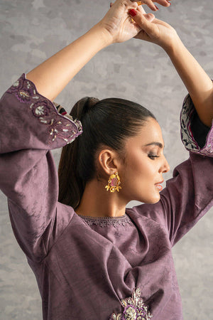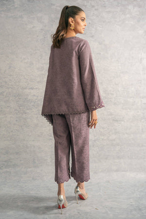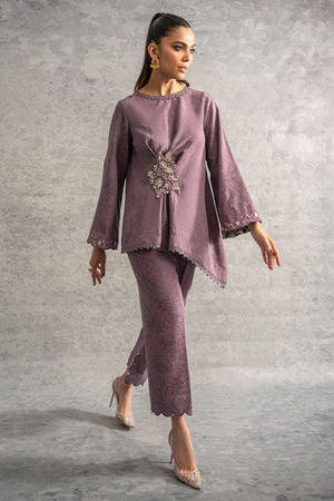 An eye catching lavender short asymmetrical shirt with a heavily embellished motif, completed with embroidered sleeves with pearl and crystal detailing’s, paired with flared side slit pants and scalloped edgings.
