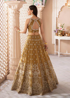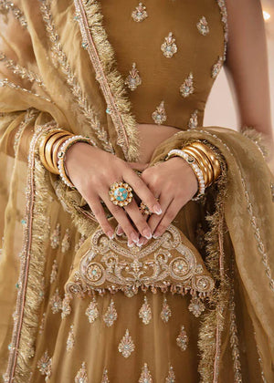 Zardozi is crafted on an olive green base, speaking of its victorious glamour. It features an exquisite organza choli, accentuated with gleaming ornamentation. The skirted lehnga is designed with floral motifs and booti spray, with dreamy pink embellishments. The hand crafted celestial dupatta is mounted with a border and a spread of embellished lines, making is a perfect choice for an intimate event.