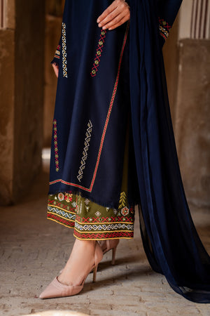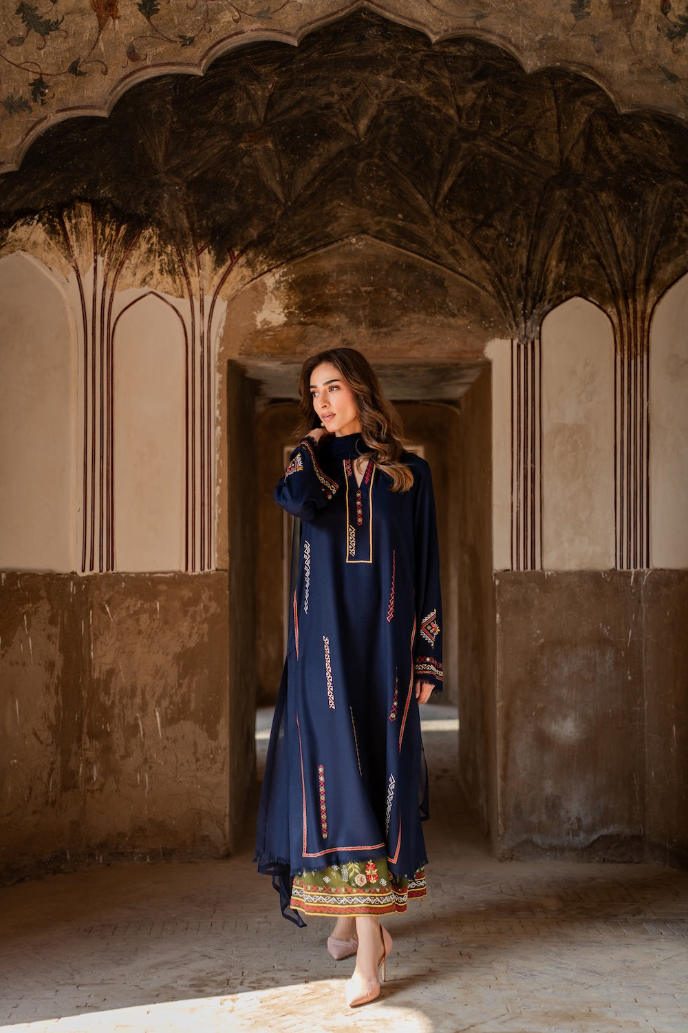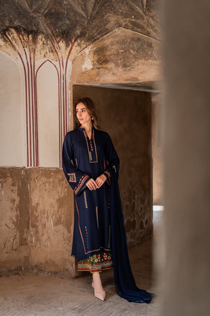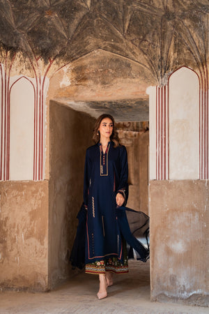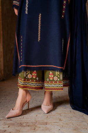 Elevate your wardrobe with this striking dark blue Karandi ensemble, a perfect blend of tradition and modern flair. The breathable, textured Karandi fabric offers a graceful fall and natural elegance, ideal for both daytime festivities and evening gatherings.