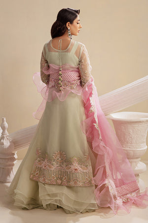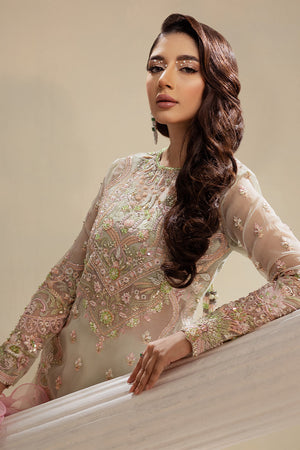 Introducing "Zareen," a timeless masterpiece in a refreshing mint green hue. This classic silhouette is adorned with delicate pastel resham thread embroidery, gracing the sleeves, front, and back of the shirt..
