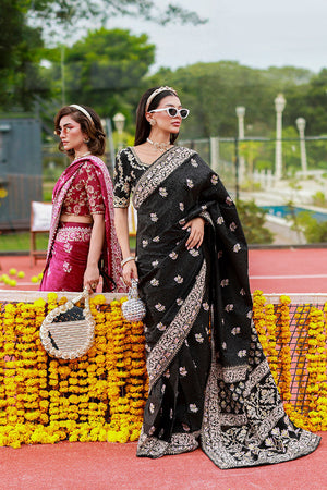 Draped in elegance, this black saree is crafted from soft medium silk and adorned with timeless block print detailing. It is paired with a raw silk blouse, hand-embellished to perfection and cut in a flattering sweetheart neckline with short sleeves. The luxurious textures and refined craftsmanship make this ensemble a statement of modern sophistication rooted in tradition.