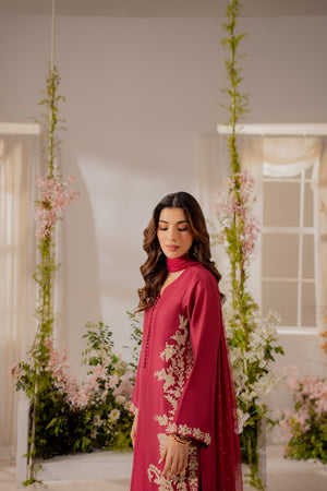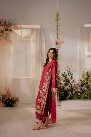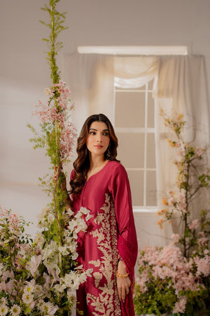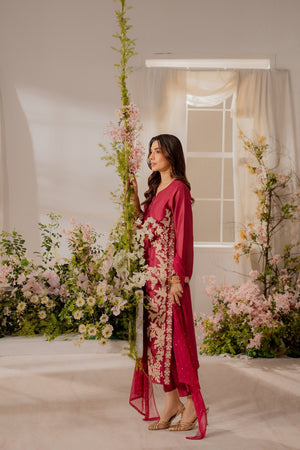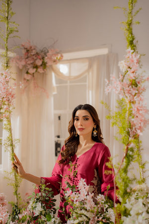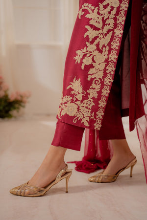 Draped in a breathtaking blend of haute plum, this ensemble features a seamless fusion of tonal embroideries, meticulously woven into the fabric. The delicate floral motifs embellish the overall outfit, adding a touch of refined femininity. Complemented by straight pants, this ensemble is designed to be a striking statement piece, elevating the beauty and allure of the festive season.
