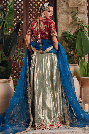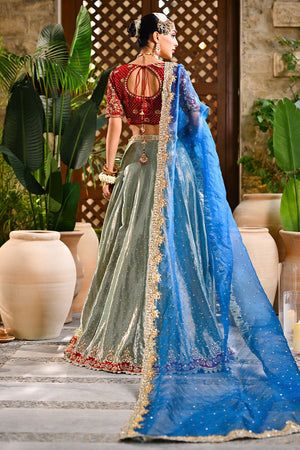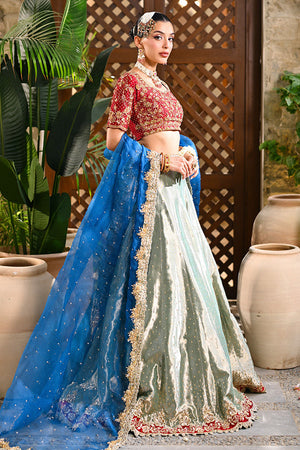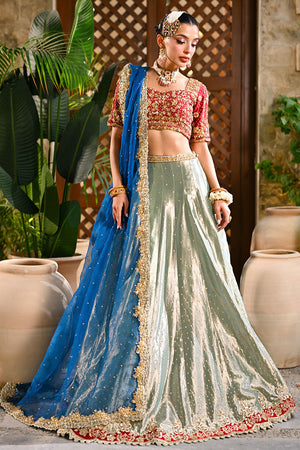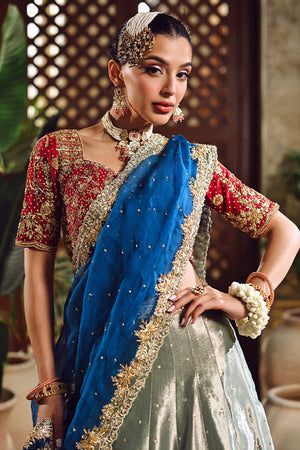 A striking lehenga choli set that plays with bold contrasts and timeless craftsmanship. The deep red raw silk choli, adorned with floral motifs, short sleeves, and intricate handwork in dabka, zardozi, and nakshi, sets a regal tone. It is paired with a refreshing mint lame lehenga featuring an appliquéd scalloped border, delicate sequins, and a sequined belt detail that adds structure and shimmer. Completing the ensemble is a royal blue net oraganzadupatta, elevated with hand-embellished borders and scattered sequins, tying together the palette in a perfect balance of vibrance and elegance.