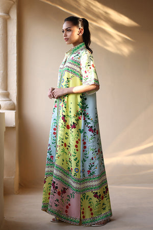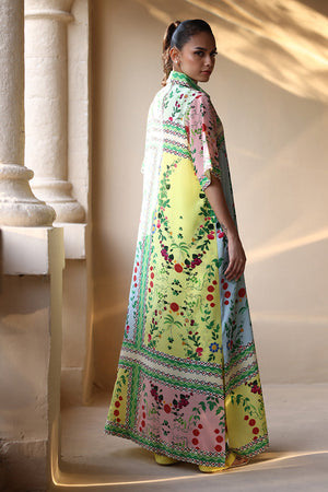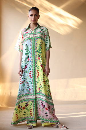 Crafted in a luxurious blend of citrus, blush and cerulean hues, this fluid crepe silhouette is adorned with playful botanical prints and geometric accents. The collared shirt flows into a sweeping hemline and is paired with matching printed crepe trousers.