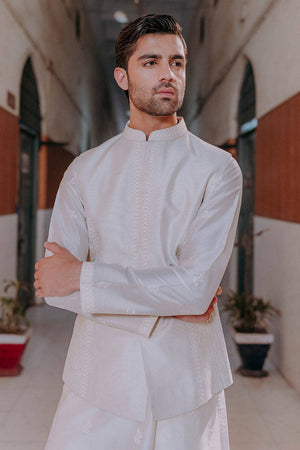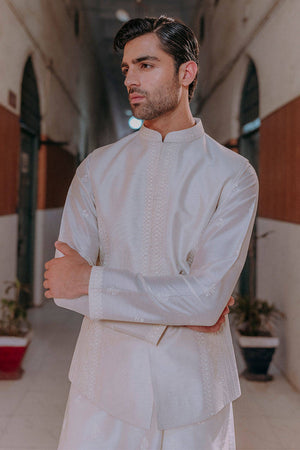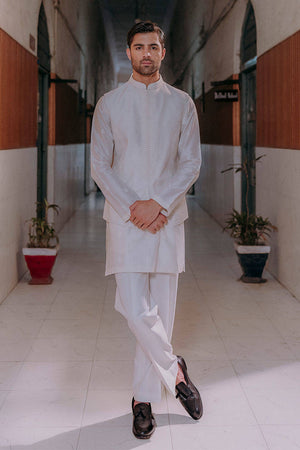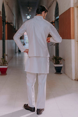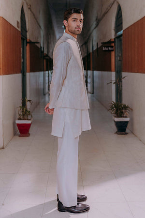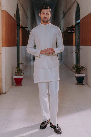 Small Mughal block-printed motifs dance across a cotton net kurta, layered under a waistcoat detailed with paisley embroidery, pintucks, and anchor work. With its nods to heritage and hands-on craft, this look channels tradition through a modern lens.