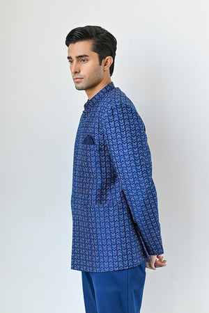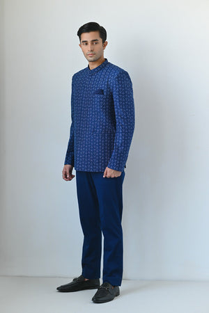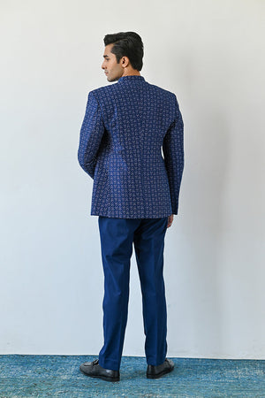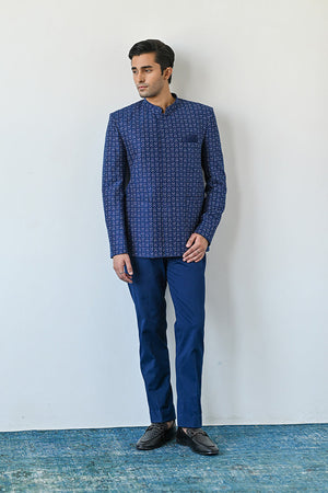 A contemporary take on a classic prince coat, Zayd is a striking cobalt hued pure rawsilk button down prince coat, embroidered with geometric patterns. Lined with the finest medium silk featuring our signature print. The solid coloured pocket square adds a subtle elegance along with matching trousers crafted from the finest wool.