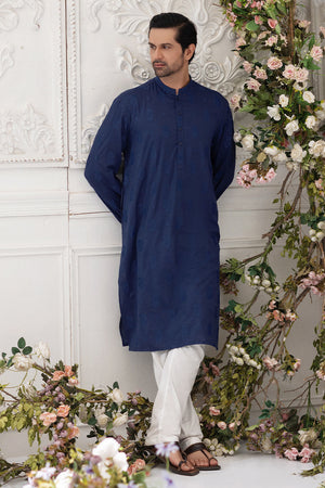 A midnight blue kurta with front button detailing, paired with white straight pants. It’s a structured yet simple combination.