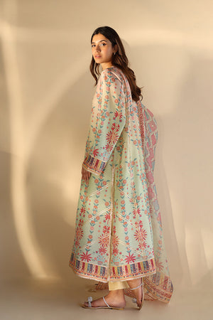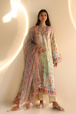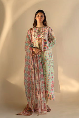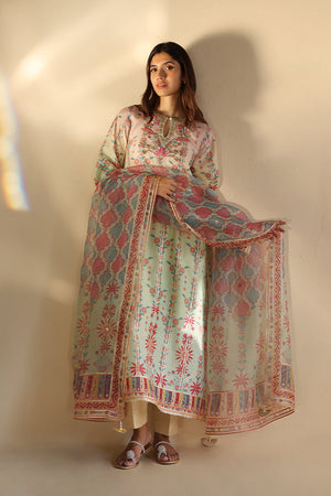 Delicate zardoze embroidery and gota detailing elevate a painterly pastel hued ombré shirt, crafted from lightweight khaddi silk. The mint green base is adorned with floral motifs in shades of pink and coral, creating a soft gradient of color. A statement border with geometric patterns and subtle accents adds depth, while a complementary organza dupatta, finished with intricate gota work, ties the look together in soft pastel tones. Eggshell toned pure rawsilk trousers complete the ensemble.