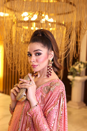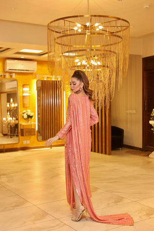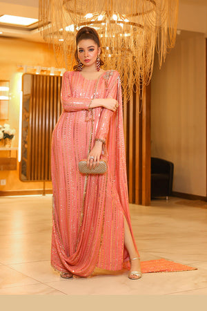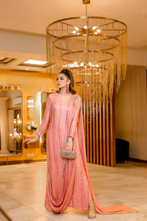 A stunning peach outfit in a modern classic cut, in chiffon fabric with intricate self embroidery & sequin work all over. Attached drape style duppata in same fabric, finished with crystal embroidered patch on one side of the shoulder.The shipping charges for all articles barring Bridals are as follows: