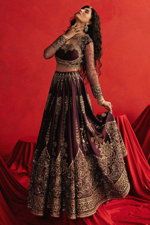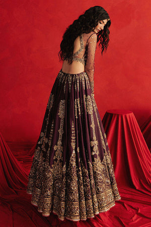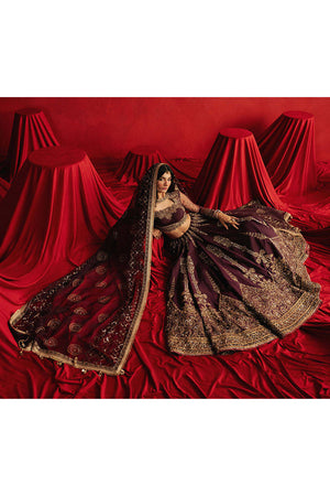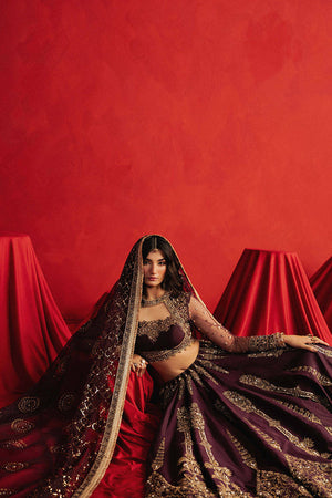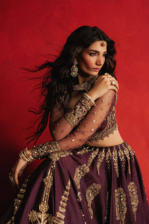 Named after the fierce poet-princess, Zeb-un-Nissa is rendered in royal purple Indian silk, this ensemble is saturated with opulence: silk appliqués, block print, adda embroidery, and mirror shimmer. The choli has full sheer sleeves that are dusted with golden motifs and framed with layered decorative borders in embroidery, sequins, and beads. Its neckline is traced with gold floral vines that curl like verses from a ghazal. The lehenga begins with persian boteh motif, then transitions into slender cypress trees, before bursting into a symphony of circular vines and paisley patterns all block printed in gold and embroidered by hand with sequins, mirror work, and metallic threads. The hemline is wrapped in multiple embroidered borders layered with gota patti and finishing trims. The organza dupatta is no less regal, featuring decorative roundels and Mughal jaali-inspired motifs, edged with thick gold borders and beaded tassels that flirt with the wind