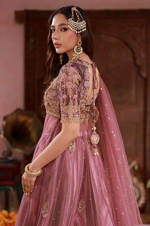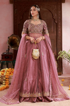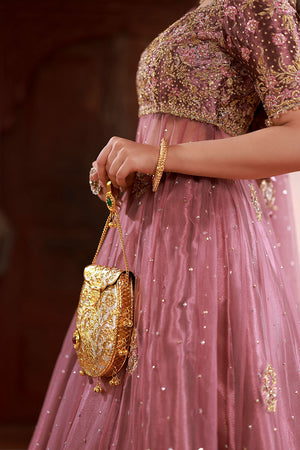 This body kalidaar features a tissue lama bodice and net kalis with bootis and border detailing. Embroidered using silver-gold kaam with dabka, pitta, moti, sequins, and tiki stones. Styled with a plain tissue lama lehenga and a net dupatta with chan and organza borders.