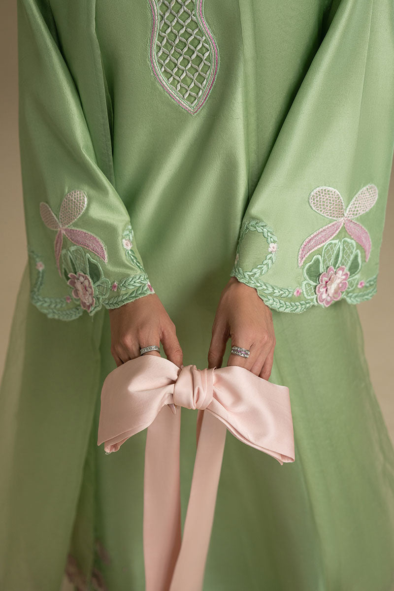 Bold yet graceful, this apple green ensemble reimagines tradition with an avant-garde twist. The long shirt features striking, modern embroidery that effortlessly blends intricate design with contemporary flair. A unique cutline accentuates the figure, creating a sleek and stylish silhouette. Paired with flared pants, the look is both dynamic and elegant, offering a sense of fluid movement. The modern dupatta, simple yet refined, completes the ensemble with a touch of sophistication. A perfect balance of cutting-edge design and timeless appeal, this outfit is made for those who embrace both style and individuality.