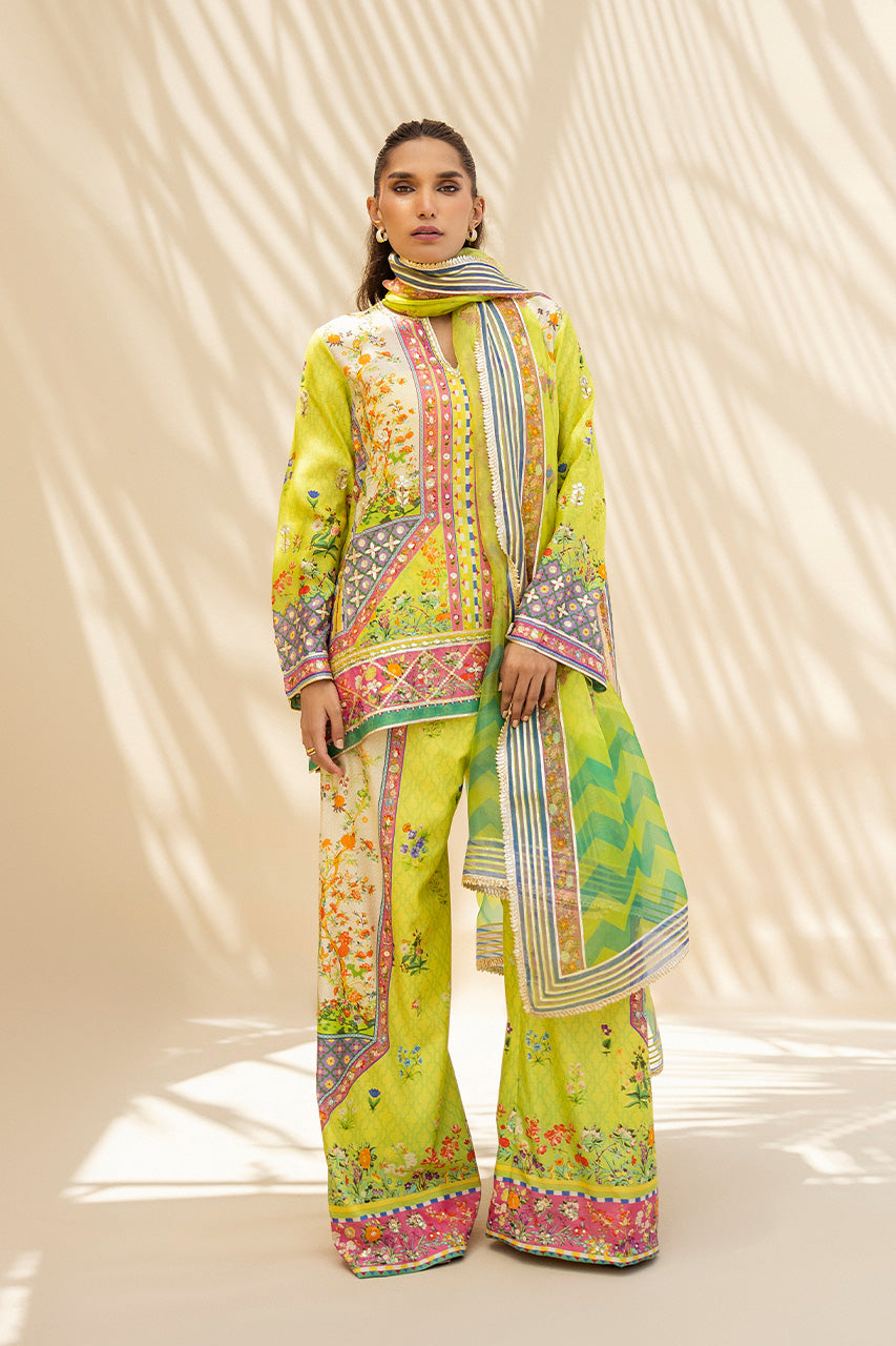 A khaddi silk top in lime tone and candy pink tones features intricate floral painterly prints, accented with delicate gota and sequin embroidery. The cascading organza dupatta in a lime hue is enriched with subtle blush and gold florals and finished with gota detailing along the borders. It is paired with wide-legged khaddi silk trousers adorned with a complementing print and scattered gota, offering a contemporary expression of traditional elegance.