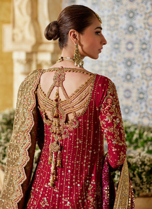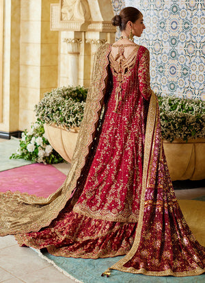 The meticulously selected unique shade of crimson is the bridal color of the season. The voluminous kalidaar has a heavy floral neckline that follows lines of intricate mukesh interlaced with hand embellished vines and floral butis. It has a wide heavily embellished daaman which is gorgeously worked with a meticulous sallop border with rust and copper appliques that add to the vintage traditional aura of this heirloom bridal. This elegant shirt is complemented with a farshi lengha made in ruby red pure jamawar, heavily worked with chan and chariyaan all over. It is bordered with rust-applique scallop border.It features a pure copper zari silk dupatta which has a border composed with red and rust appliques running simultaneously with a hand worked heavily embellished scallop border. The pallu is generously decorated with sunburst medallion motifs with mukesh detailing.The dupatta features a beautiful display of heavy chan and butis with vibrant floral bunches all over. The perfect combination of colors makes it a unique outfit which will give the bride a gorgeously royal look.