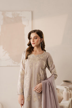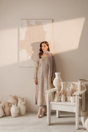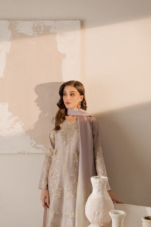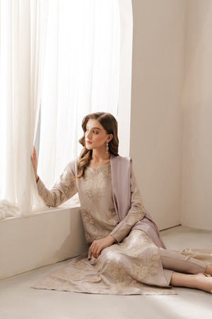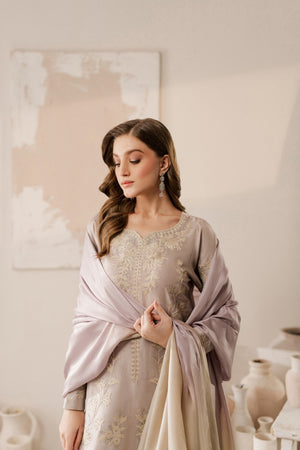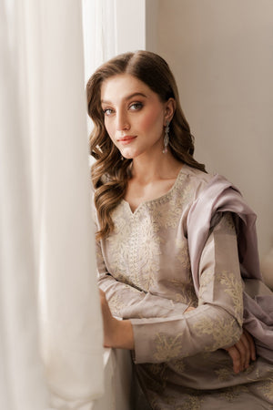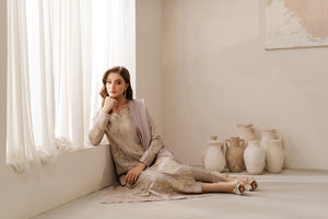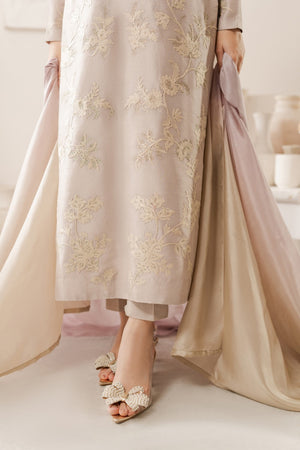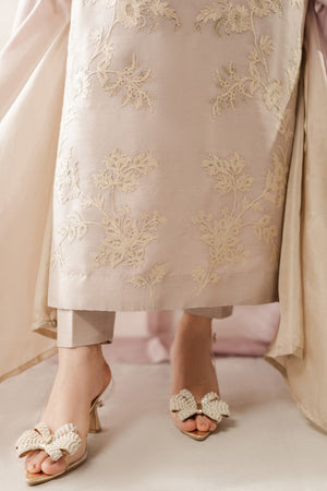 Composed with subtle tones on a rawsilk canvas, the kurta is adorned with delicate hand-aari embroidery with floral imagery and features fabric manipulated details. Paired with a pure medium silk dupatta, this is going to be a head-turner for you!