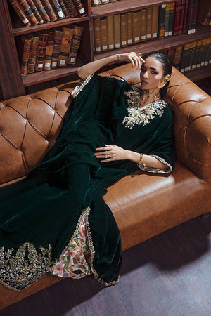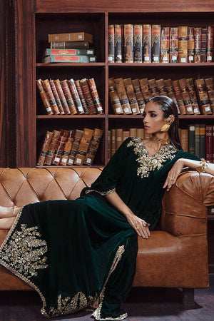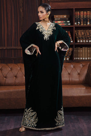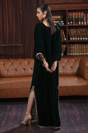 Emerald green luxe kaftan with hand embellishments along the front neckline, hem borders, and sleeves with printed lining.